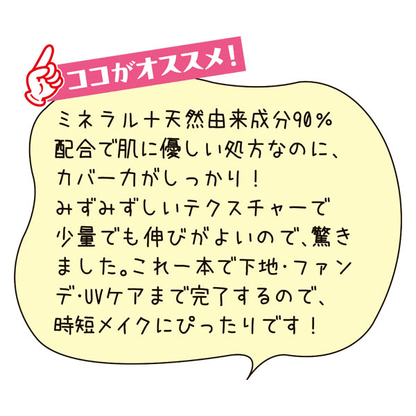 ミネラル+天然由来成分約90%。気になる部分をカバーしながらツヤと透明感※1あふれる仕上がりを実現。